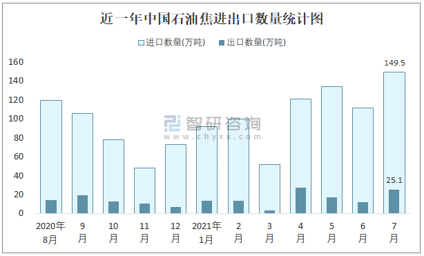 近一年中國石油焦進出口數(shù)量統(tǒng)計圖