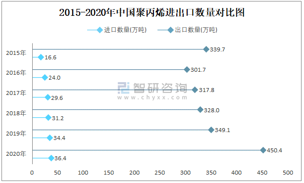 2015-2020年中國聚丙烯進出口數量對比統計圖