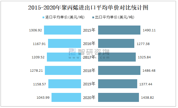 2015-2020年聚丙烯進出口平均單價對比統計圖