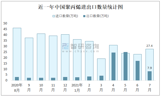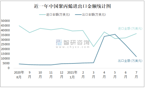 根據中國海關數據顯示:2021年7月中國聚丙烯進口數量為27.4萬噸,出口數量為7.9萬噸;進口金額為36516萬美元,出口金額為12061萬美元;近一年中國聚丙烯出口總金額小于進口總金額,貿易逆差為主,7月進口均價1332.7美元/噸。