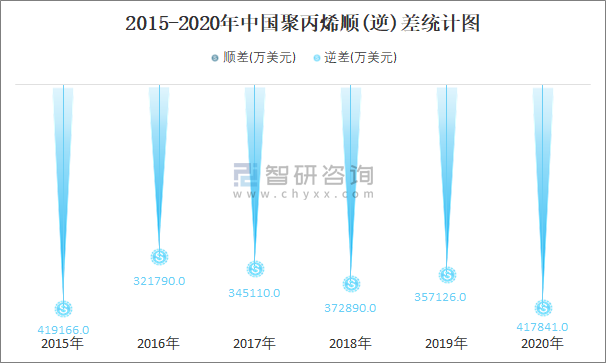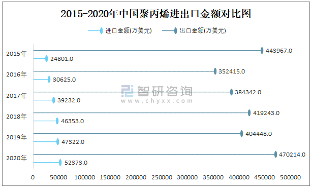 2015-2020年中國聚丙烯進出口金額對比統計圖