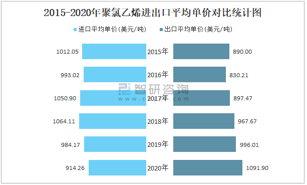 2015-2020年聚氯乙烯進出口平均單價對比統計圖