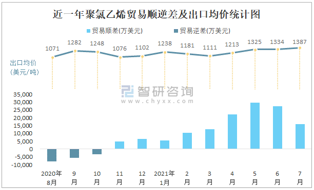 根據中國海關數據顯示:2021年7月中國聚氯乙烯進口數量為3.6萬噸,出口數量為15.8萬噸;進口金額為6071萬美元,出口金額為21908萬美元;近一年中國聚氯乙烯出口總金額大于進口總金額,貿易順差為主,7月出口均價1386.6美元/噸。