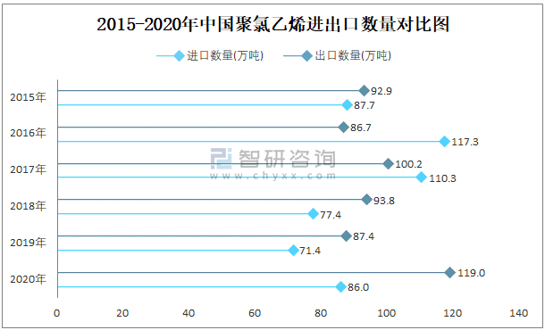 2015-2020年中國聚氯乙烯進出口數量對比統計圖