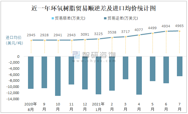 近一年環氧樹脂貿易順逆差及進口均價統計圖