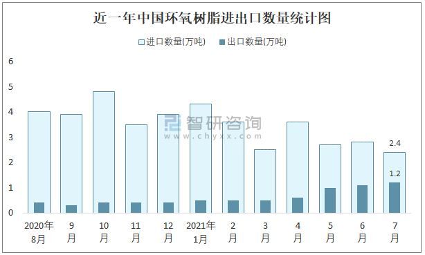 近一年中國環氧樹脂進出口數量統計圖