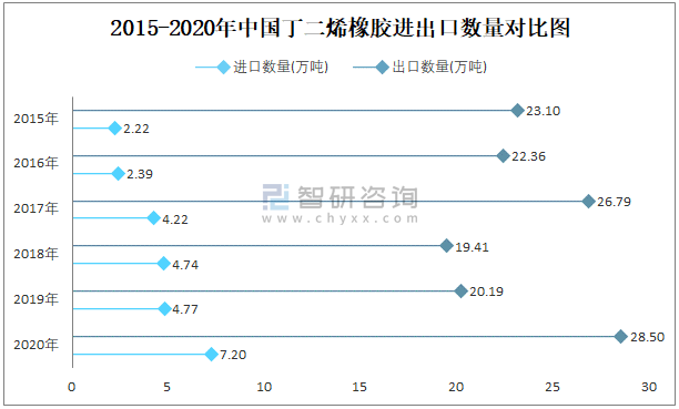 2015-2020年中國丁二烯橡膠進出口數量對比統計圖