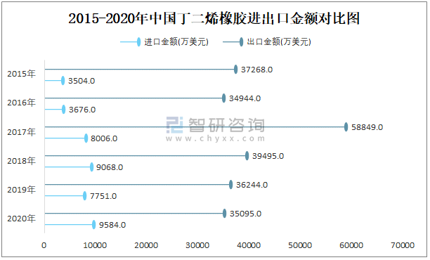 2015-2020年中國丁二烯橡膠進出口金額對比統計圖