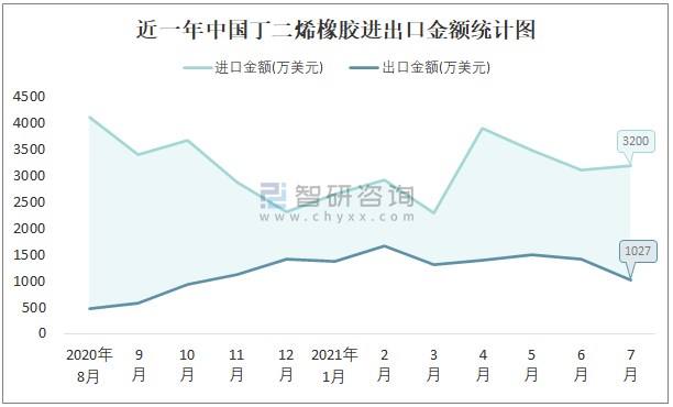 近一年中國丁二烯橡膠進出口金額統計圖