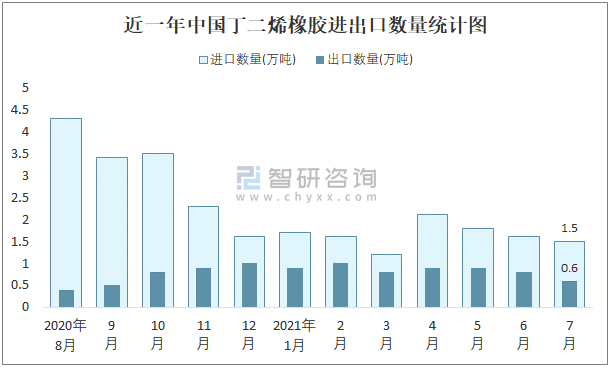 近一年中國丁二烯橡膠進出口數量統計圖