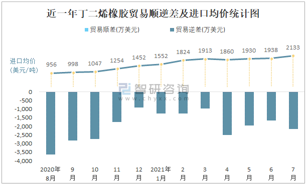 根據中國石油和化學工業聯合會數據顯示:2021年7月中國丁二烯橡膠進口數量為1.5萬噸,出口數量為0.6萬噸;進口金額為3200萬美元,出口金額為1027萬美元;近一年中國丁二烯橡膠出口總金額小于進口總金額,貿易逆差為主,7月進口均價2133.3美元/噸。