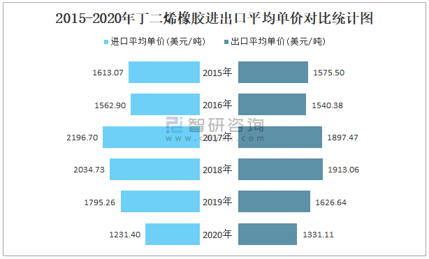 2015-2020年丁二烯橡膠進出口平均單價對比統計圖