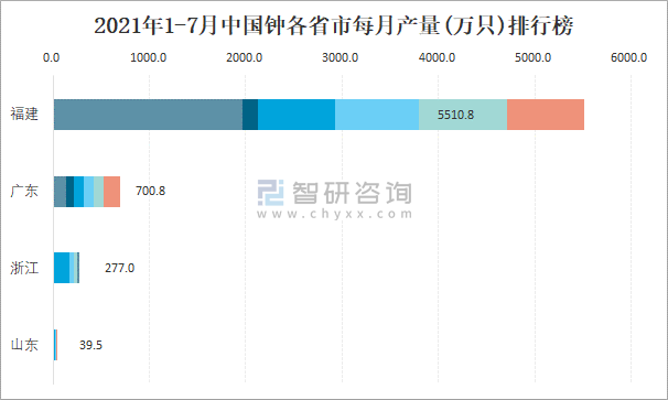 2021年1-7月中國鐘各省市每月產量排行榜