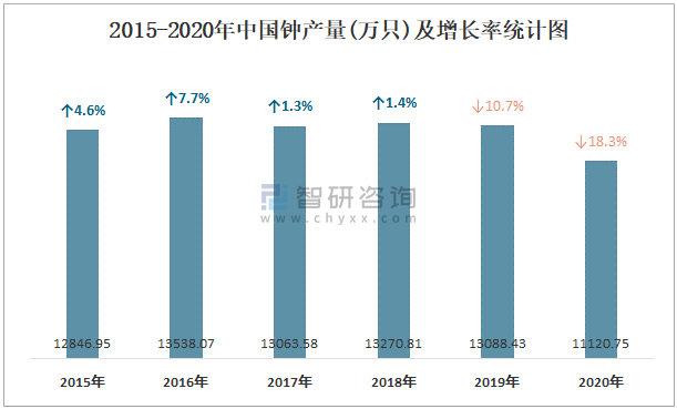 2015-2020年中國鐘產量及增長率統計圖