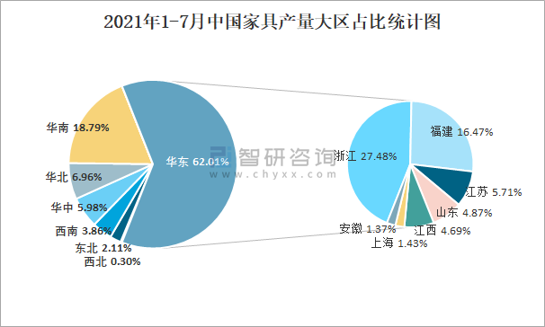 2021年1-7月中國家具產量為61322.7萬件 華東地區產量最高(占比62.01%)