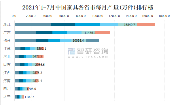 根據國家統計局數據顯示:2021年各季度(第三季度暫只統計7月數據)中國家具主要集中在華東、華南、華北地區生產;2021年1-7月中國家具產量大區分布不均衡,其中華東地區產量最高,特別是浙江省貢獻了最多產量;2021年1-7月中國家具各省產量top1領先于其他前9名,浙江、廣東、福建等省產量最多。