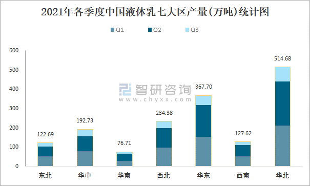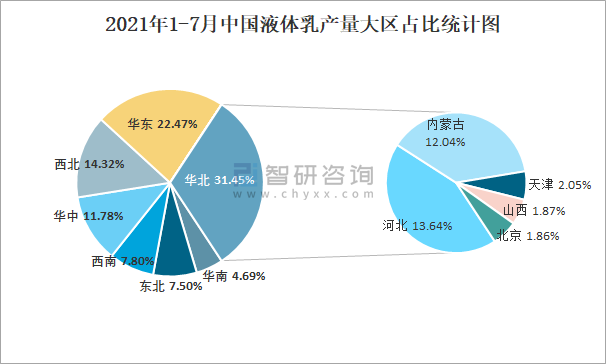 根據國家統計局數據顯示:2021年各季度(第三季度暫只統計7月數據)中國液體乳主要集中在華北、華東、西北地區生產;2021年1-7月中國液體乳產量大區分布相對均衡,其中華北地區產量最高,特別是河北省貢獻了最多產量;2021年1-7月中國液體乳各省產量呈現梯隊式分布,河北、內蒙古兩省產量最多。