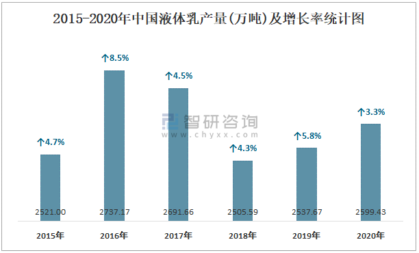 根據國家統計局數據顯示:2021年7月中國液體乳產量為240萬噸,同比增長0.31%;2021年1-7月中國液體乳累計產量為1636.5萬噸,同比增長14.61%;2015-2020年中國液體乳產量2018年跌至最低,此后逐年遞增。