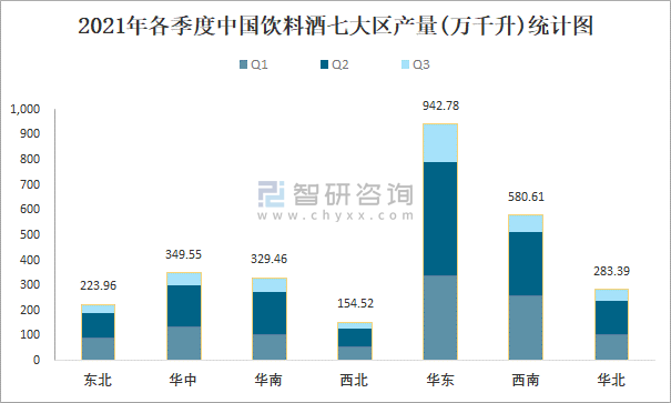 2021年各季度中國飲料酒七大區(qū)產(chǎn)量統(tǒng)計圖