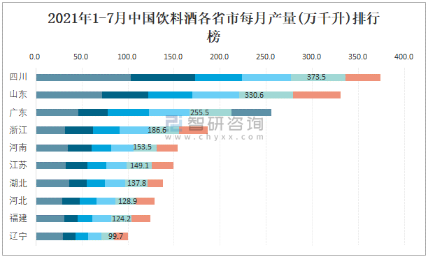 2021年1-7月中國飲料酒各省市每月產(chǎn)量排行榜