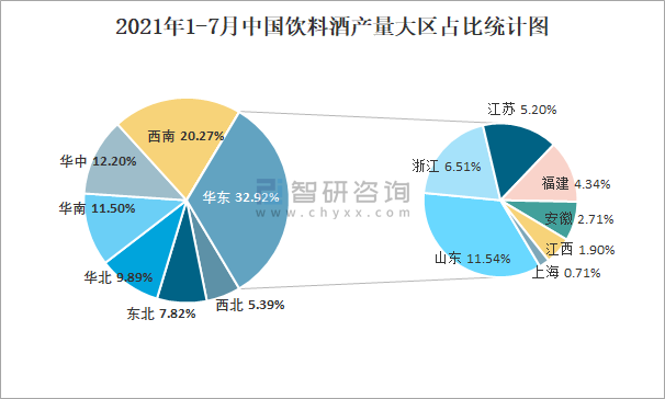2021年1-7月中國飲料酒產(chǎn)量大區(qū)占比統(tǒng)計圖