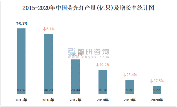 2015-2020年中國熒光燈產量及增長率統計圖