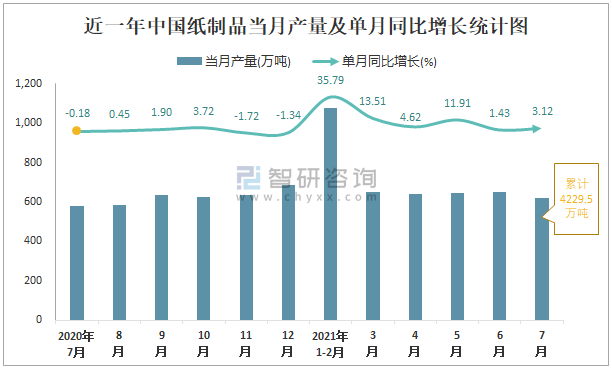 根據國家統計局數據顯示:2021年7月中國紙制品產量為621萬噸,同比增長3.12%;2021年1-7月中國紙制品累計產量為4229.5萬噸,同比增長13.38%;2015-2020年中國紙制品產量2019年達到最高,次年有所下滑。