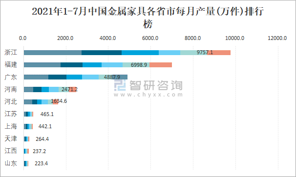 2021年1-7月中國金屬家具各省市每月產量排行榜
