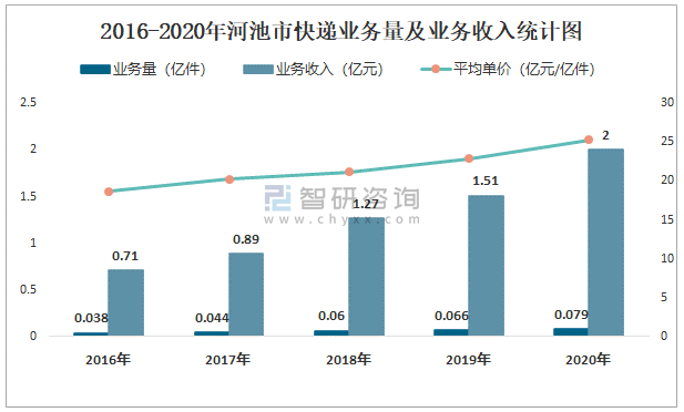 2016-2020年河池市快遞業(yè)務(wù)量及業(yè)務(wù)收入統(tǒng)計圖