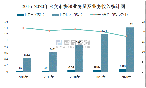 2016-2020年來賓市快遞業務量及業務收入統計圖