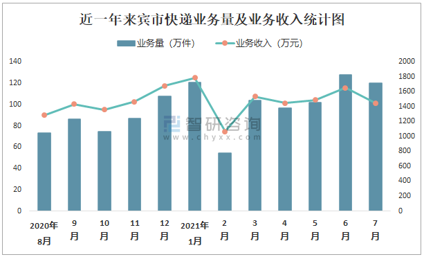 近一年來賓市快遞業務量及業務收入統計圖