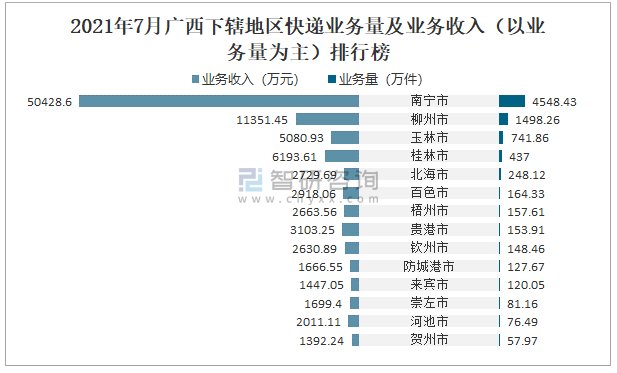 2021年7月廣西下轄地區快遞業務量及業務收入(以業務量為主)排行榜