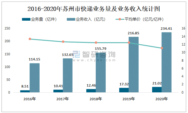 2016-2020年蘇州市快遞業(yè)務量及業(yè)務收入統(tǒng)計圖