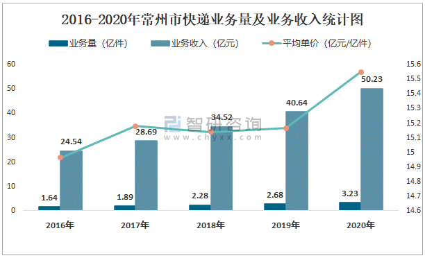 2016-2020年常州市快遞業務量及業務收入統計圖