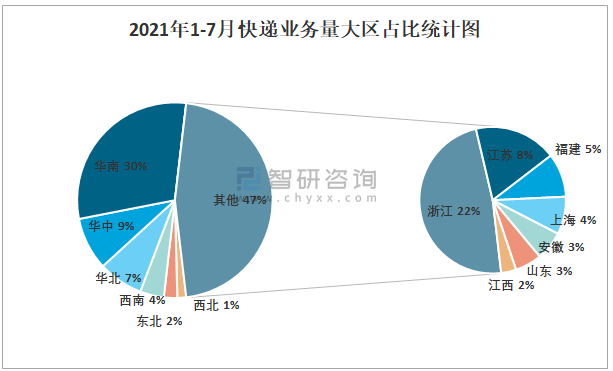 2021年1-7月快遞業務量大區占比統計圖