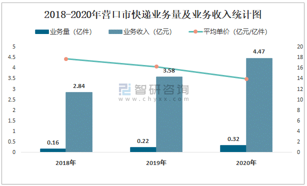 2018-2020年營口市快遞業(yè)務量及業(yè)務收入統(tǒng)計圖