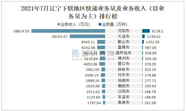 2021年7月遼寧下轄地區(qū)快遞業(yè)務量及業(yè)務收入(以業(yè)務量為主)排行榜