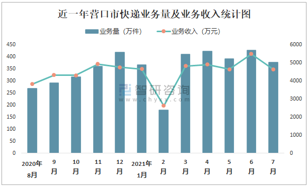 近一年營口市快遞業(yè)務量及業(yè)務收入統(tǒng)計圖