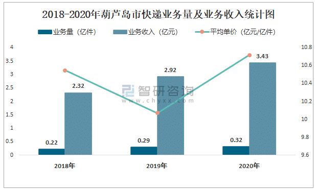2018-2020年葫蘆島市快遞業務量及業務收入統計圖