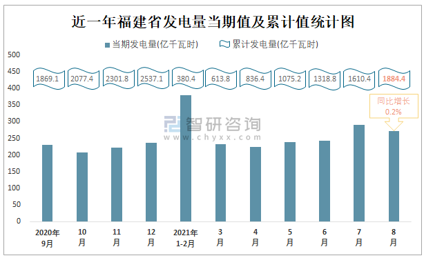 根據國家統計局數據統計可知:2021年8月福建省發電量為270.9億千瓦時,同比增長0.2%,2021年1-8月福建省發電量為1884.4億千瓦時,累計增長14.6%;2021年1-8月福建省主要有5種類型發電量,發電量占全國比重約為3.5%,其中火力發電量為1141.2億千瓦時,占福建省發電量比重約為60.56%,占全國發電量比重約為2.12%,是福建省最大發電量類型。