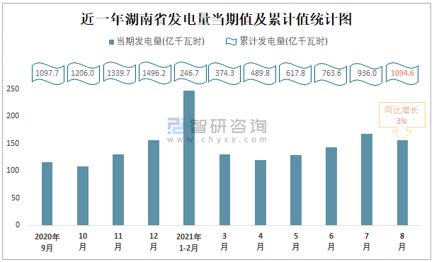 近一年湖南省發(fā)電量當(dāng)期值及累計值統(tǒng)計圖