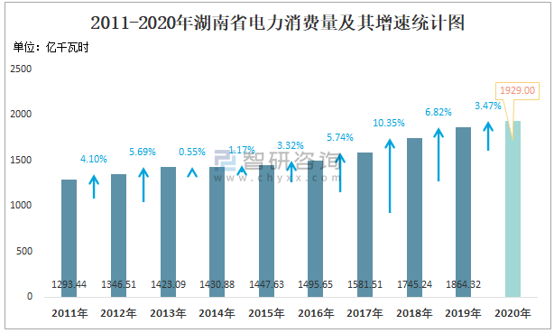 2011-2020年湖南省電力消費量及其增速統(tǒng)計圖