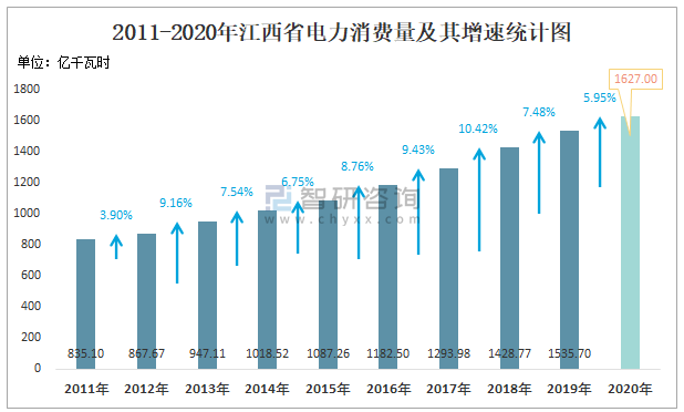 根據國家統計局數據統計可知:2011-2020年江西省發電量有所波動,總體呈現上升趨勢,從發電量類型來看,火力發電量占比最大(2020年占比為87.87%),且近10年有所波動,總體呈現上升趨勢;2011-2020年江西省電力消費量(實物量)逐年遞增,2017年-2018年之間增幅最大,為10.42%,2020年江西省電力消費量(實物量)達到1627億千瓦時。