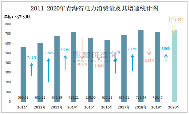 2011-2020年青海省電力消費量及其增速統(tǒng)計圖
