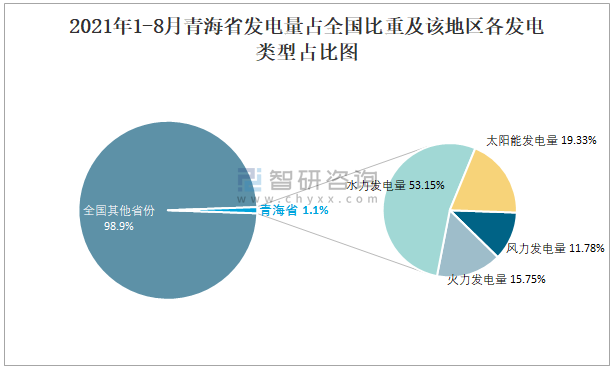2021年1-8月青海省發(fā)電量占全國比重及該地區(qū)各發(fā)電類型占比圖