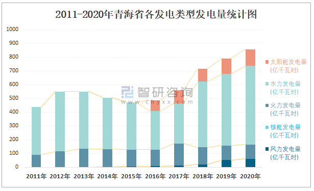 2011-2020年青海省各發(fā)電類型發(fā)電量統(tǒng)計圖