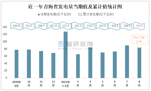 近一年青海省發(fā)電量當期值及累計值統(tǒng)計圖