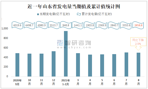 近一年山東省發電量當期值及累計值統計圖