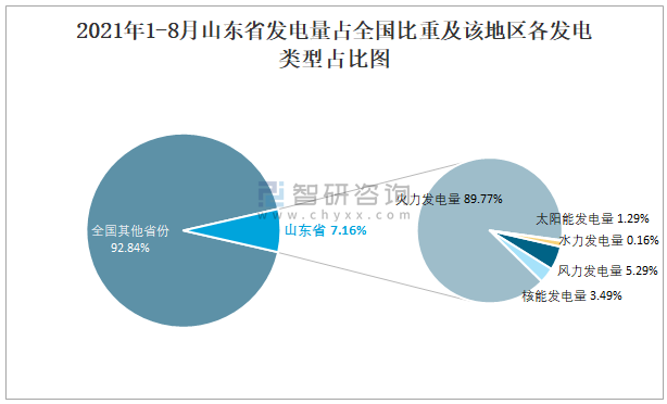 2021年1-8月山東省發電量占全國比重及該地區各發電類型占比圖