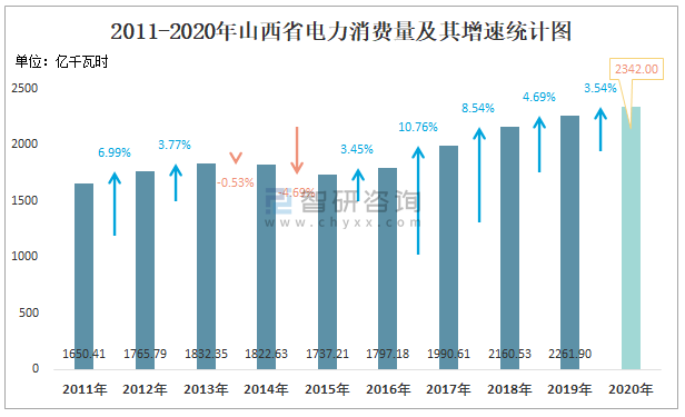 2011-2020年山西省電力消費(fèi)量及其增速統(tǒng)計(jì)圖